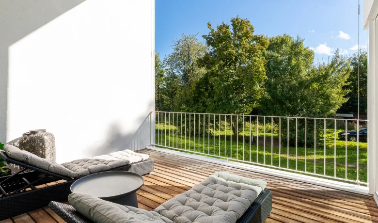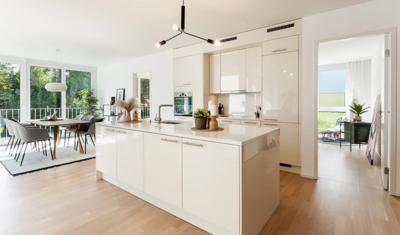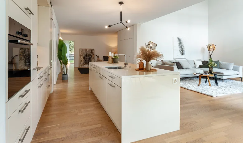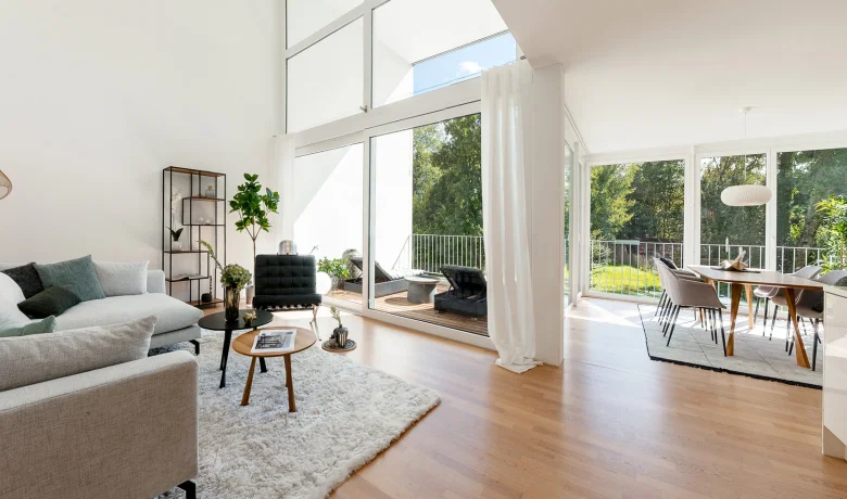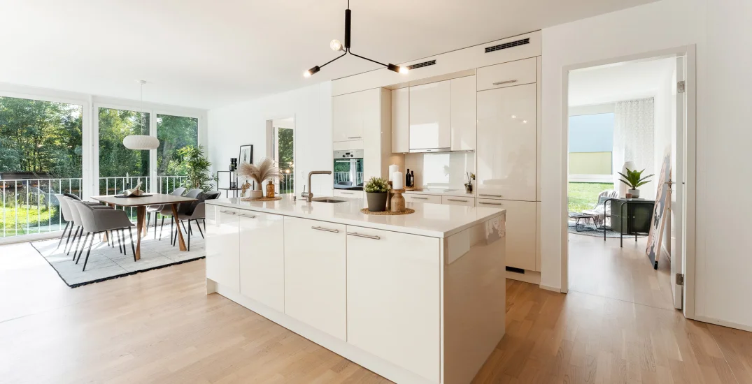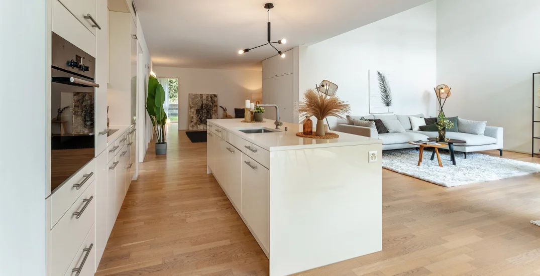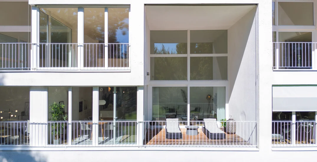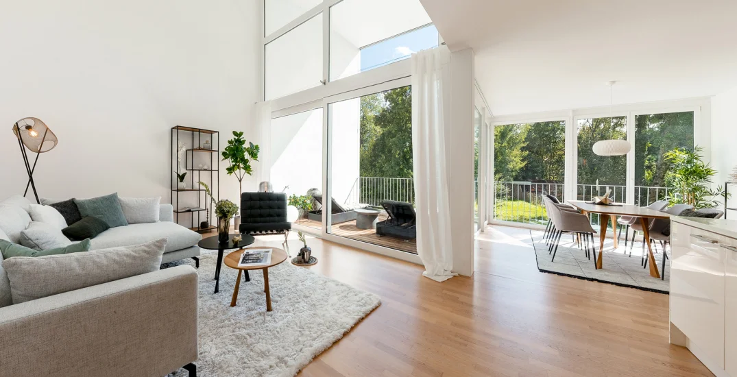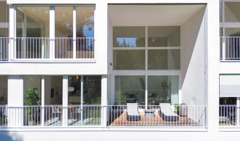 Die Eigentumswohnungen bestechen durch ihre markante Deckenhöhe und ausgesprochen grossen Fensterfronten. Dadurch werden die Räume mit viel Tageslicht versorgt. Hochwertige Parkett- und Plattenböden sowie eine Waschmaschine und ein Tumbler sind in jeder Wohnung vorhanden. Die Balkone verfügen über überdurchschnittlich hohe Decken und bieten den Einwohnern reichlich Platz zur individuellen Einrichtung.