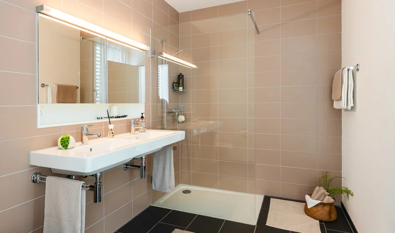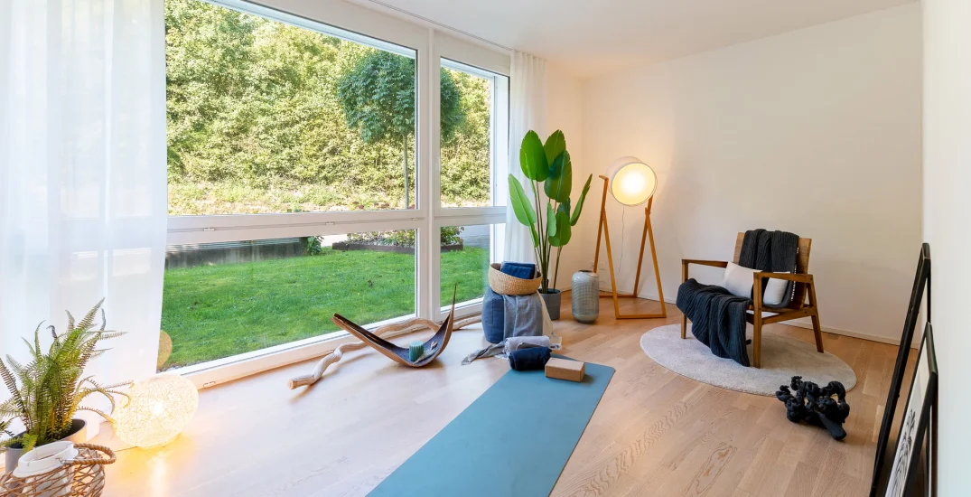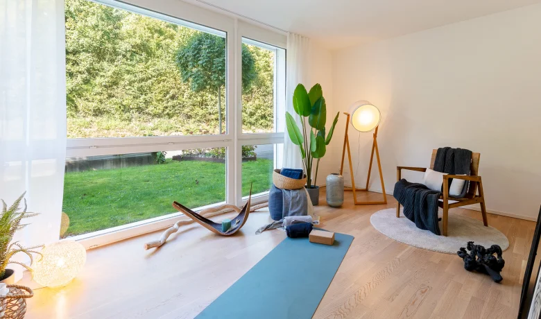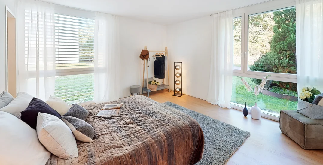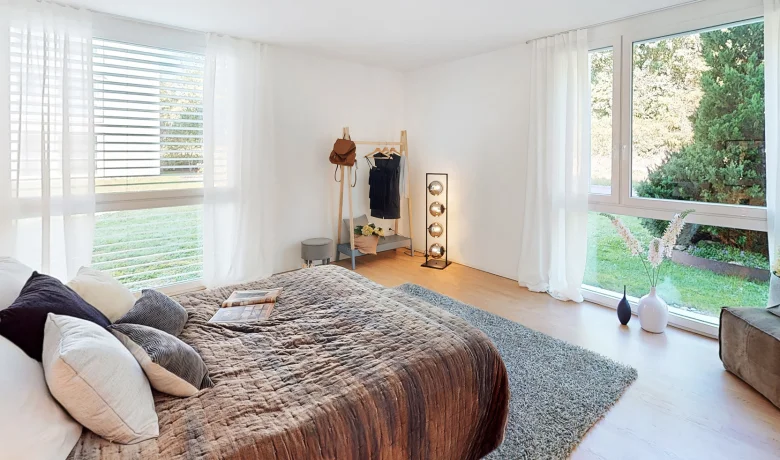 Der Aussenbereich bietet eine uneingeschränkte Sicht in die umliegende Umgebung. Nur wenige Gehminuten von den Wohnungen entfernt liegt der Wald, welcher zum Spazieren und Entspannen einlädt. Eine Tiefgarage mit Einstellplätzen, eigene Kellerabteile und Veloräume runden das Angebot ab.